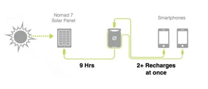 Solar Ready™ (Listo para energía solar): Punta de carga integrada; sin cables adicionales que perder. Se carga en 4 horas vía USB o en 9 horas de sol pleno conectándolo al panel Nomad 7.