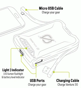 El Venture 30 ofrece la potencia necesaria para mantener cargados tus dispositivos pequeños, cámaras y tabletas, sin importar las inclemencias del tiempo a las que te enfrentes. Con una clasificación de impermeabilidad IPX6 y 7800 mAh, el Venture mantendrá todo funcionando a la perfección.
