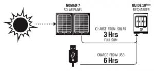 El Nomad 7 carga directamente la mayoría de los dispositivos con USB y de 12 V (no carga tablets). La mayoría de los dispositivos portátiles con USB incluyen: teléfonos celulares, teléfonos inteligentes, GPS, reproductores de MP3